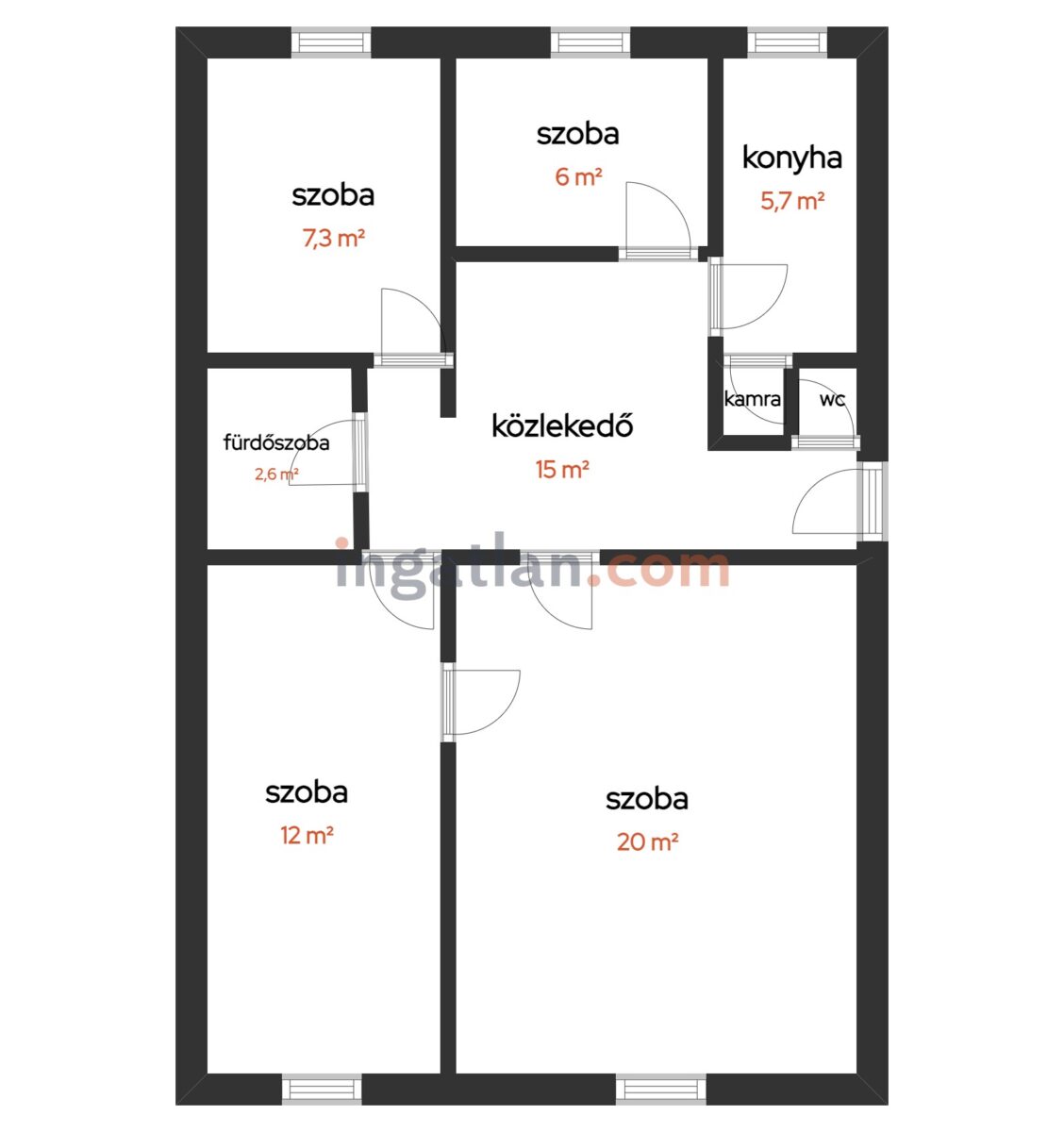 Elosztás: Kiváló családi elrendezés: 2 egész + 2 félszoba.