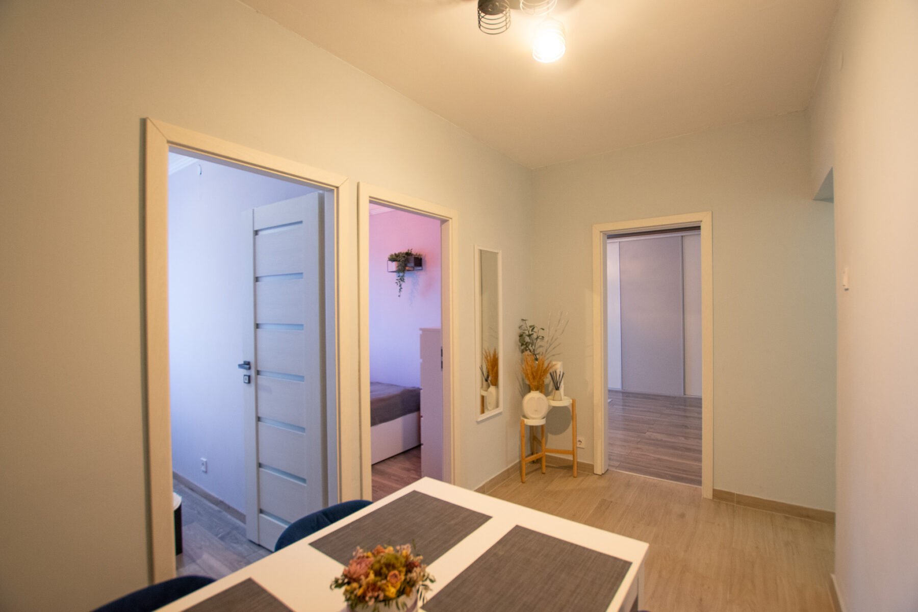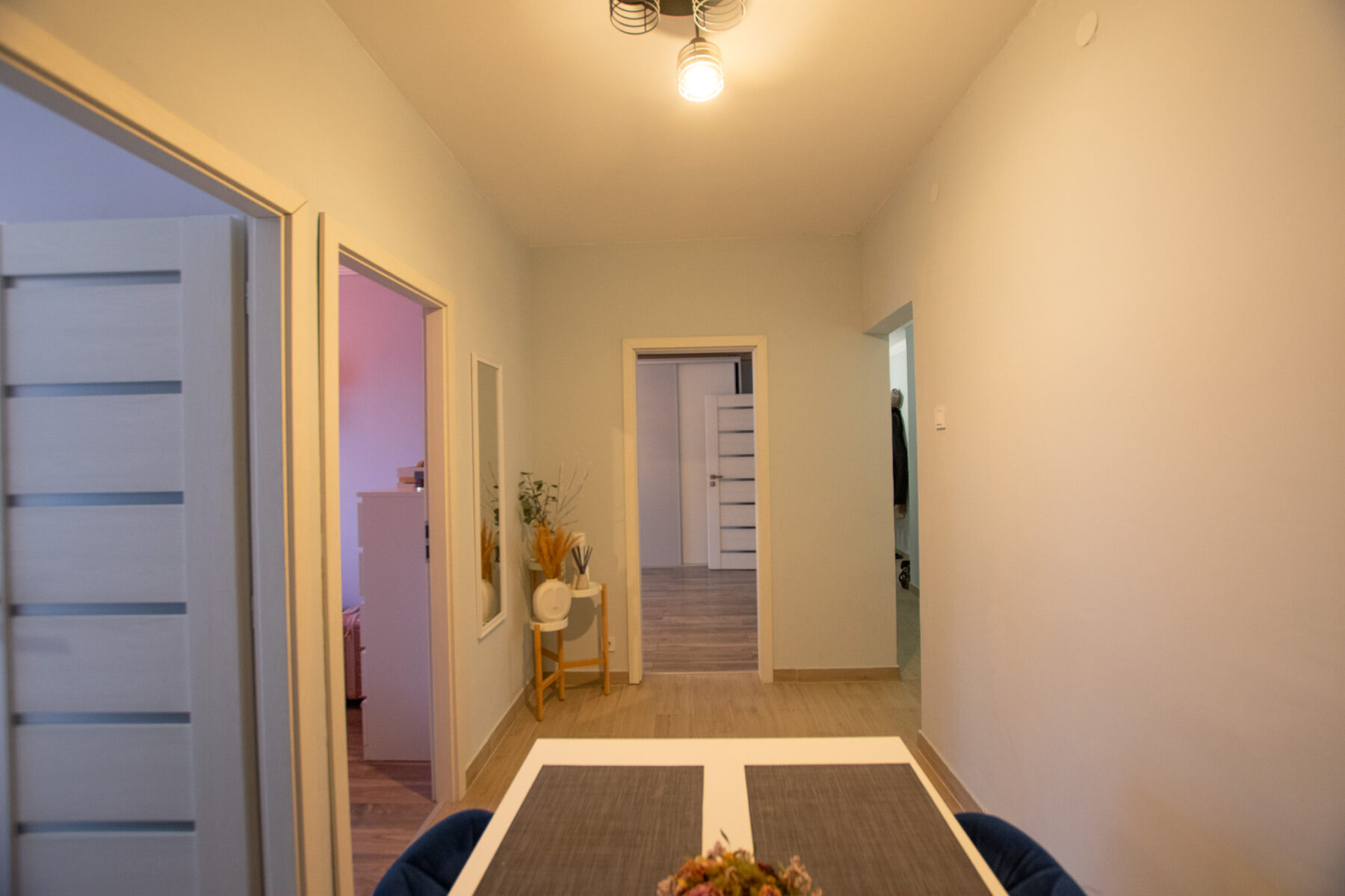 előszoba, kamra, fürdőszoba, külön WC, konyha–étkező, két külön nyíló szoba, valamint egy erkélyes nappali.